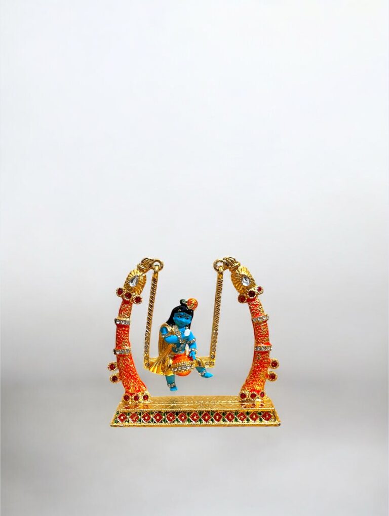 দস্তার তৈরি ছোট কৃষ্ণ বিগ্রহ – ঝুলনা সহ, পূজা ও ঘরের সাজসজ্জার জন্য আদর্শ।