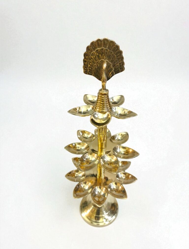 পিতলের ময়ূর হেন্ডেল 21 প্রদীপ – 16″ | 1 কেজি 200 গ্রাম | হাতে তৈরি